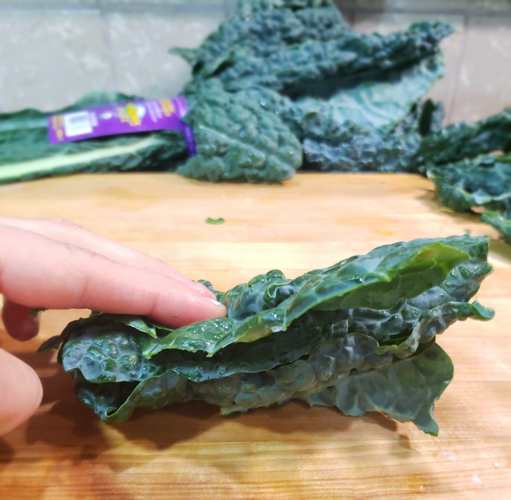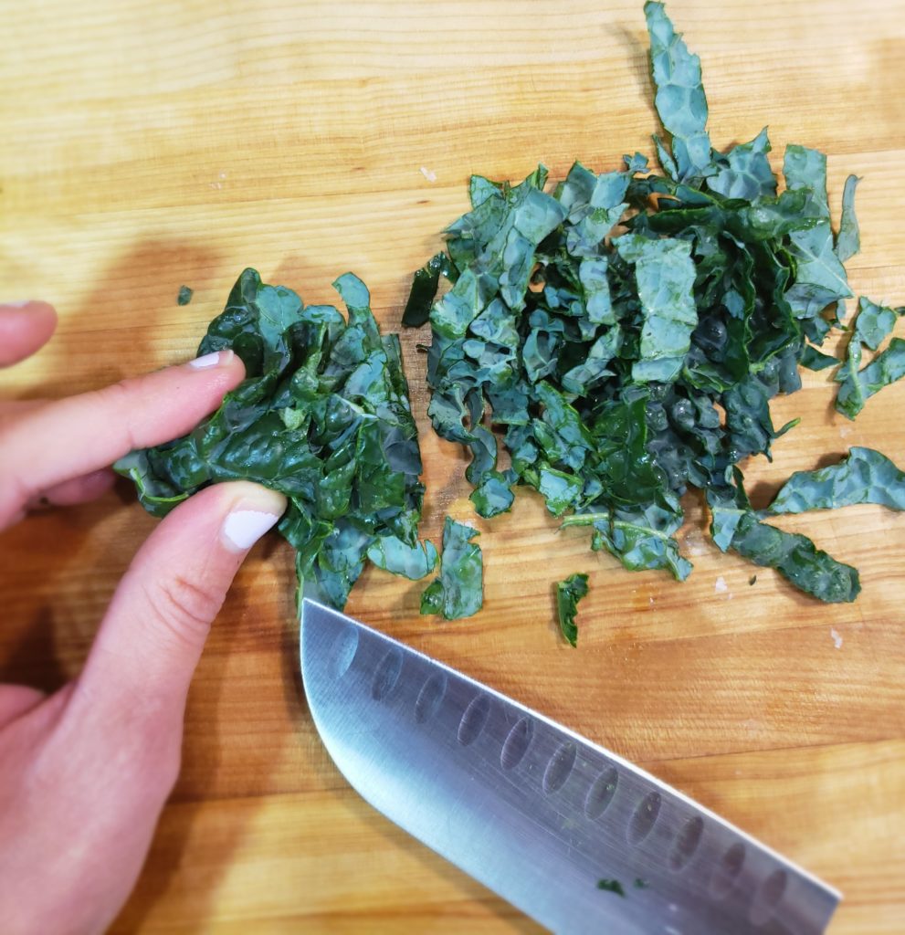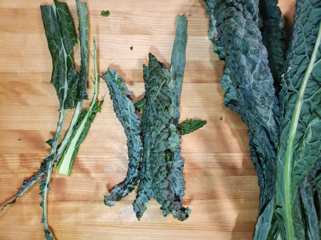 1. Tear the Kale leaves off of the stems. One long tear down the center will do. I use my hands, but you could also use a knife.