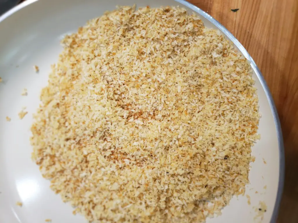 4. Meanwhile toast the breadcrumbs over medium heat with 2 tbsp. of olive oil. About 3 minutes or until most are golden brown.
