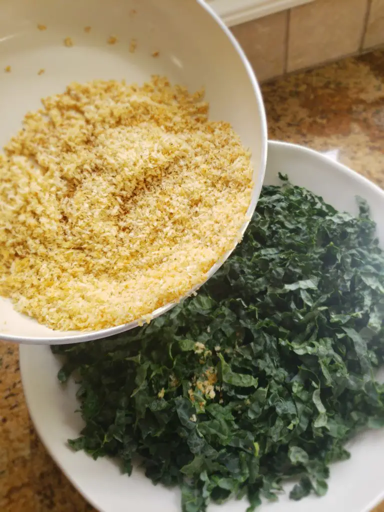 5. Combine, kale, grated Parmesan, 1 cup of dressing (or more is desired) and panko in large salad bowl.