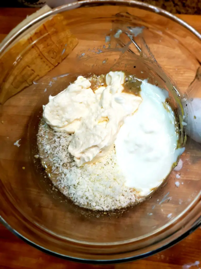 2. Add in the yogurt, mayo, and Parmesan cheese. Whisk to combine again.  At this point, you can thin is out with water to reach your desired consistency. I did not add water, but the yogurt i used was very thin, if you were using a thicker greek variety, you might need to thin it out. Just add no more than 2 tbsp at a time. You want to have control, once it’s in, it’s in.. gradual is best!