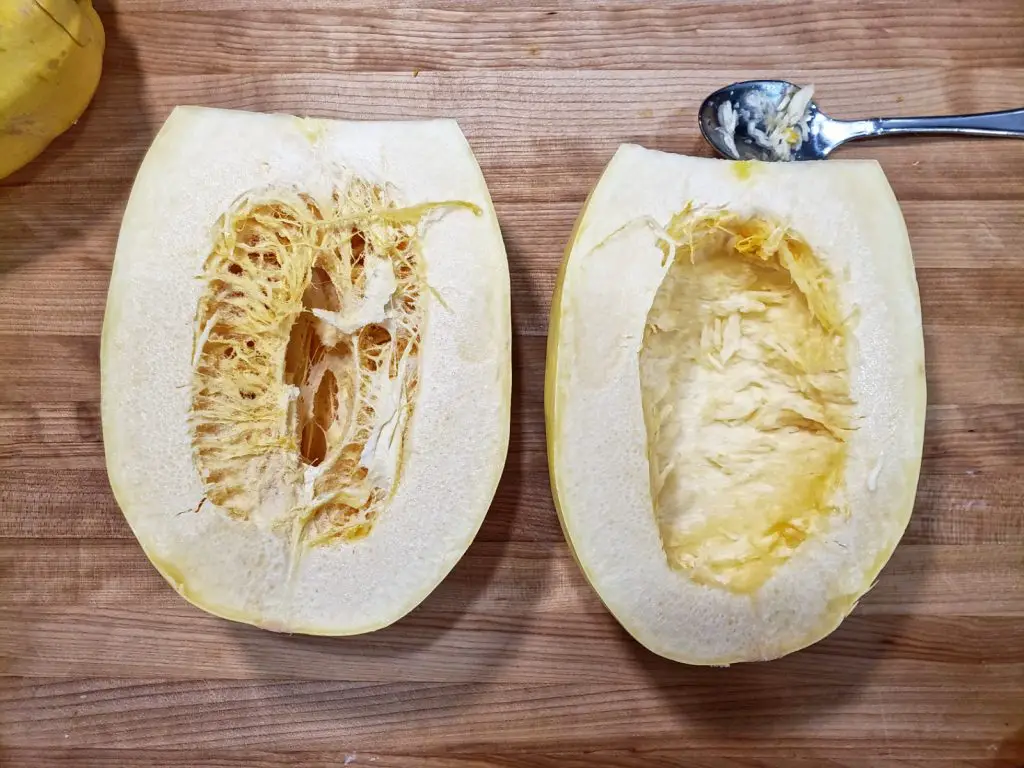 - Scoop out the seeds and fiber (similar to the way you would hollow out a pumpkin) and discard.