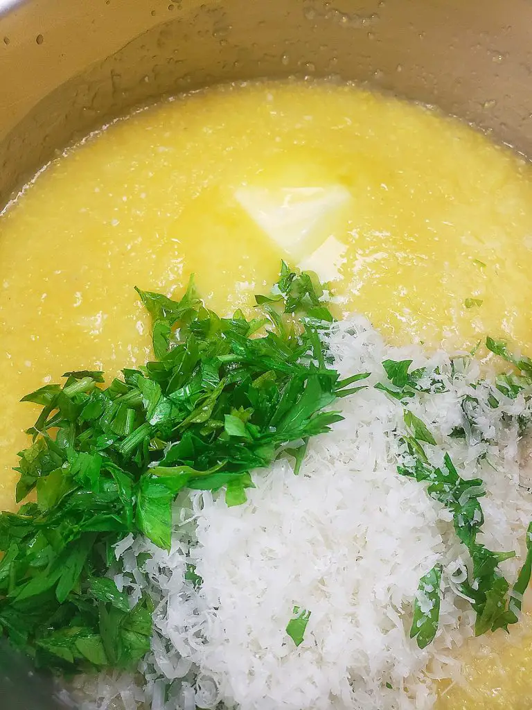 - Stir in butter, salt, pepper and Romano cheese, and parsley. Stir til melted and combined. Remove from heat, cover and set aside.