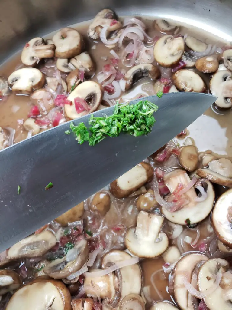 In large heavy bottom stainless steel skillet, brown mushrooms. Add shallots and Swiss chard stalks, cooking for a few minutes until shallots are turning translucent. Add garlic, being careful not to let burn.Quickly add a dry white wine and chicken stock to deglaze. Add rosemary and bring let simmer for 5 minutes