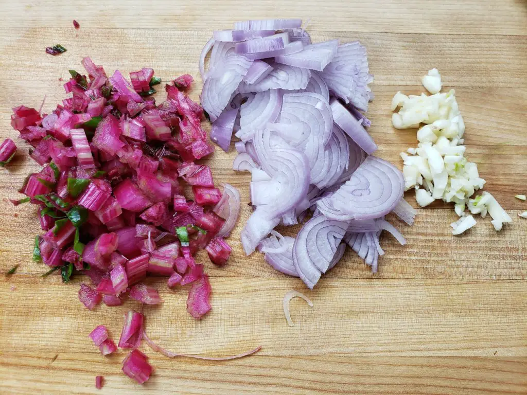 - Add shallots and swiss chard stalks, saute' for 2 min until shallots are just translucent