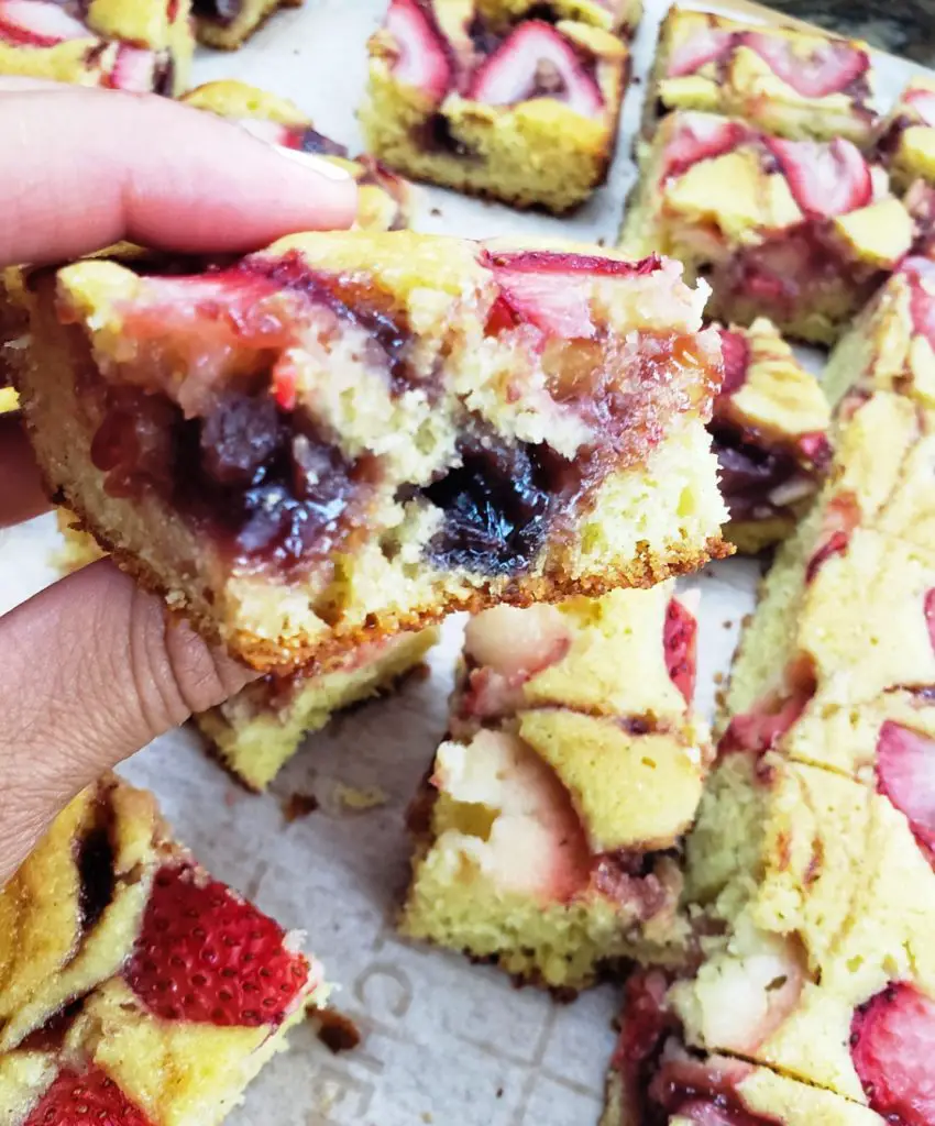 Cut into bite sized little squares, this cake is like a sweet cross between a spongecake and cornbread, with with fruity ribbons of strawberry jam and fresh strawberry slices to make it ever-so appealing to the eyes. I am please to report that not 1 crumb was left behind that day, my friends. Not one single cornmealy crumb!