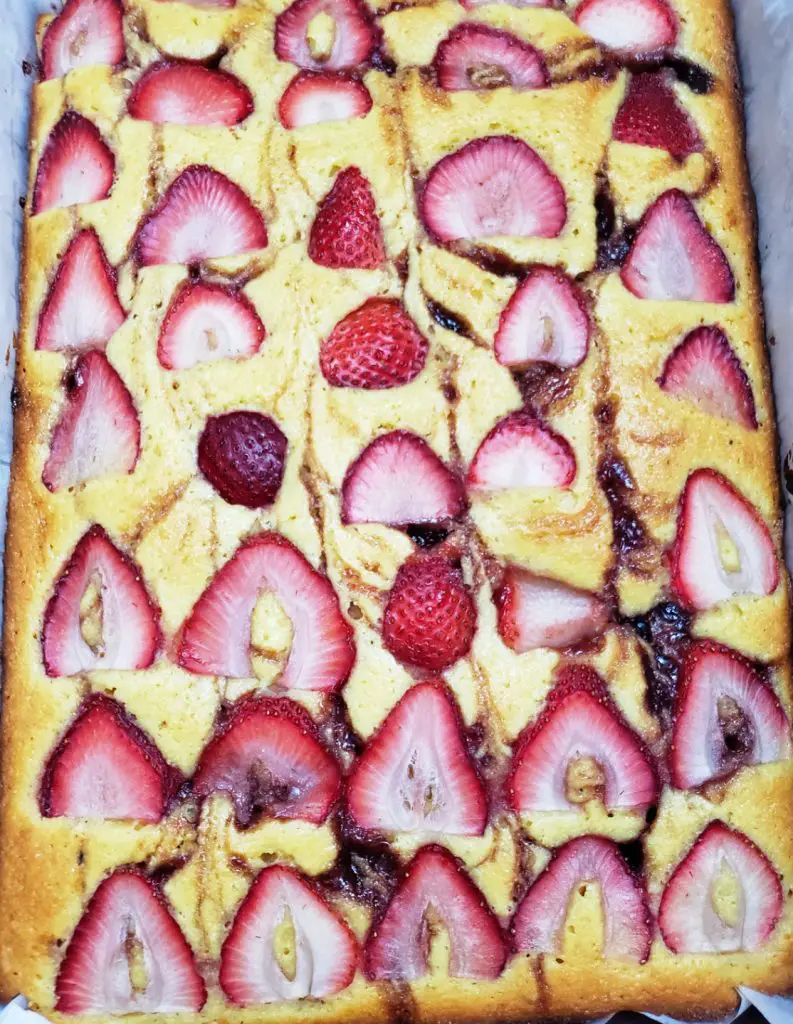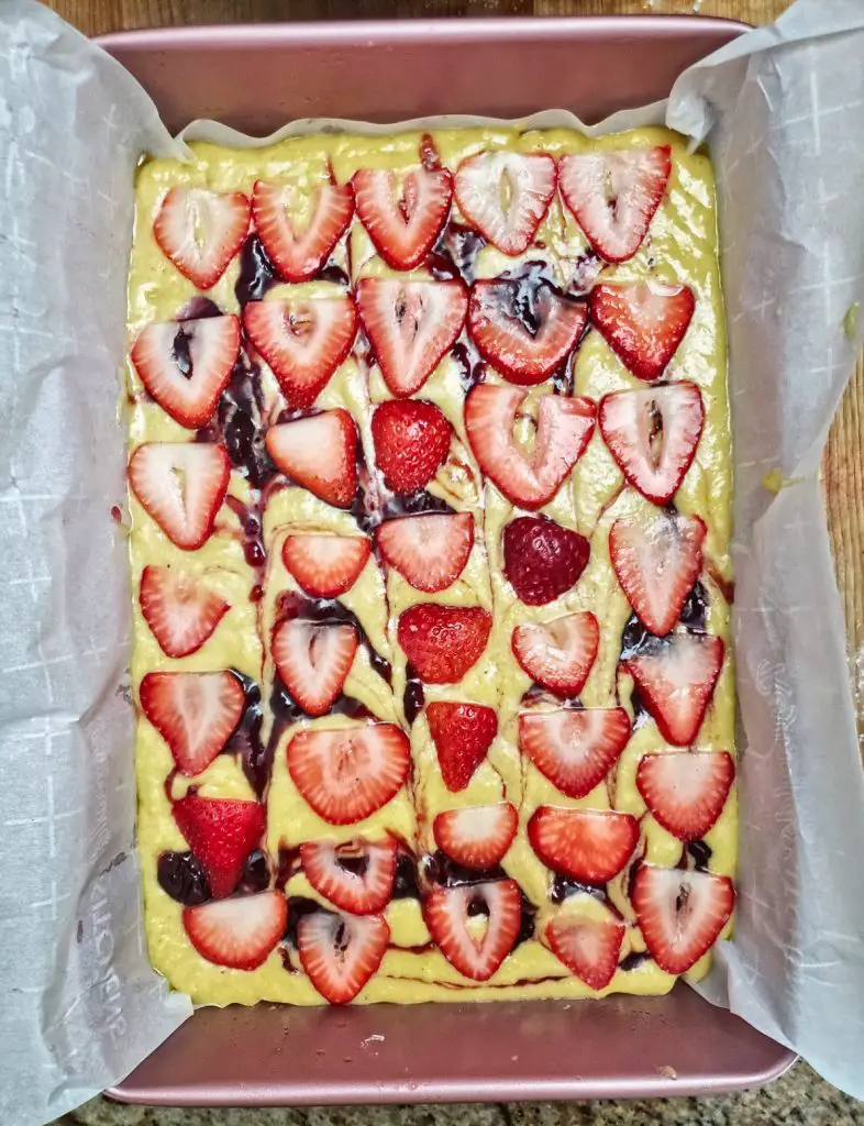 - Scrape batter into prepared pan and spread evenly. Using a small spoon, dollop jam onto surface. Using a butter knife or small offset spatula, gently swirl jam into batter. Arrange reserved strawberries on top of batter in even rows, touching at widest points.