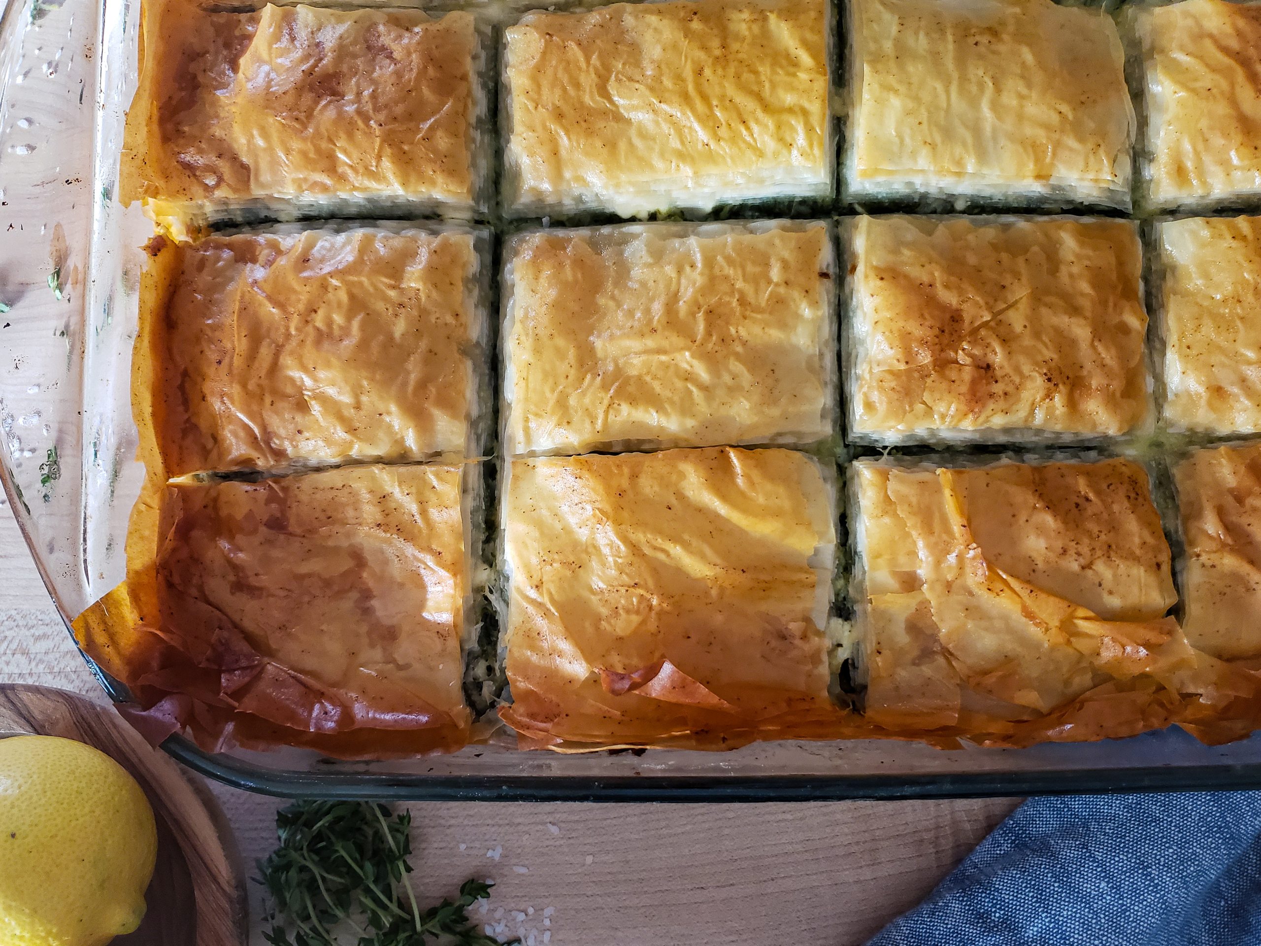 Spanakopita is a delicious savory Greek pie made of perfectly crispy layers of phyllo dough and a comforting filling of spinach and feta cheese. It’s perfect for a large crowd, to serve as a main dish or as vegetable based side dish accompaniment.