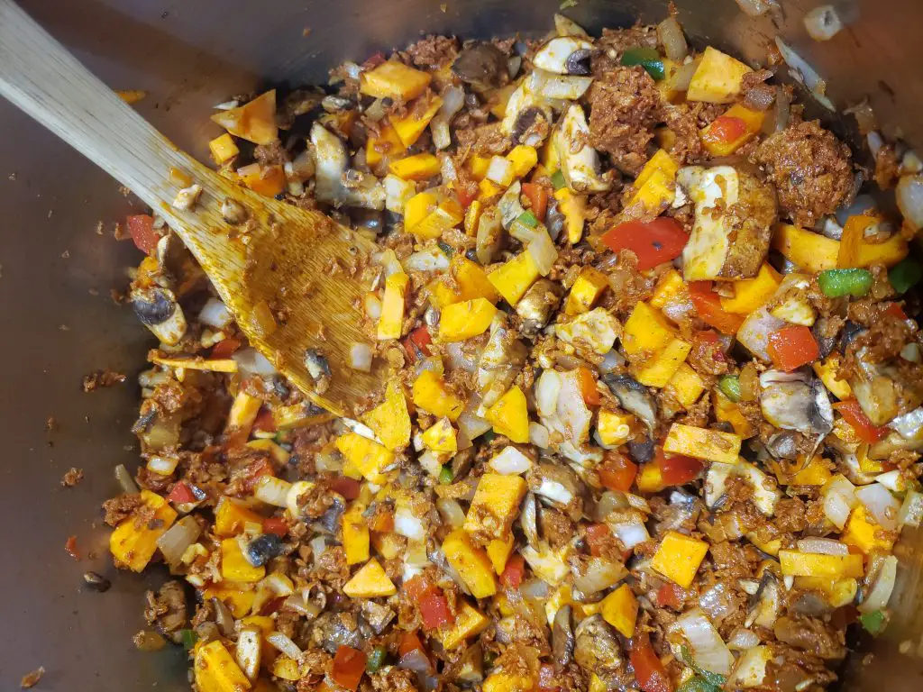 - Add sweet potato and portobello and garlic. Saute' another 5 minutes. Add spices: salt, pepper, chili powder, cumin, smoked paprika. And then remove chorizo from casing and crumble in the pot.