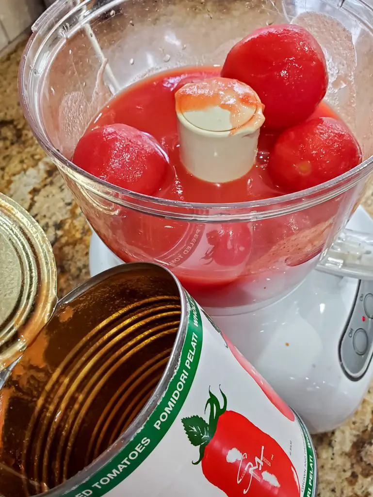 - Empty entire can of whole peeled tomatoes with juices into a food processor. Pulse to crush the tomatoes.