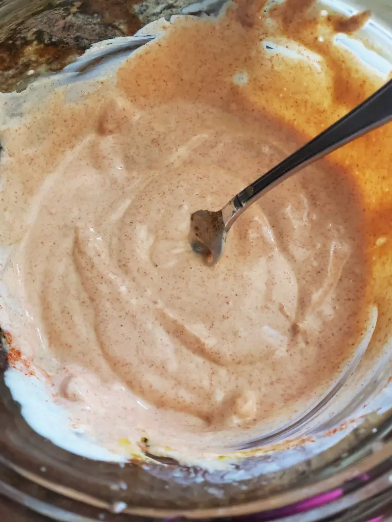 • In large mixing bowl, combine yogurt, smashed garlic, lemon juice, olive oil, paprika, salt, cumin, corriander, and cayenne pepper. If you are using a thick Greek yogurt you will need to add abotu 1/4 cup of water to thin it out.
