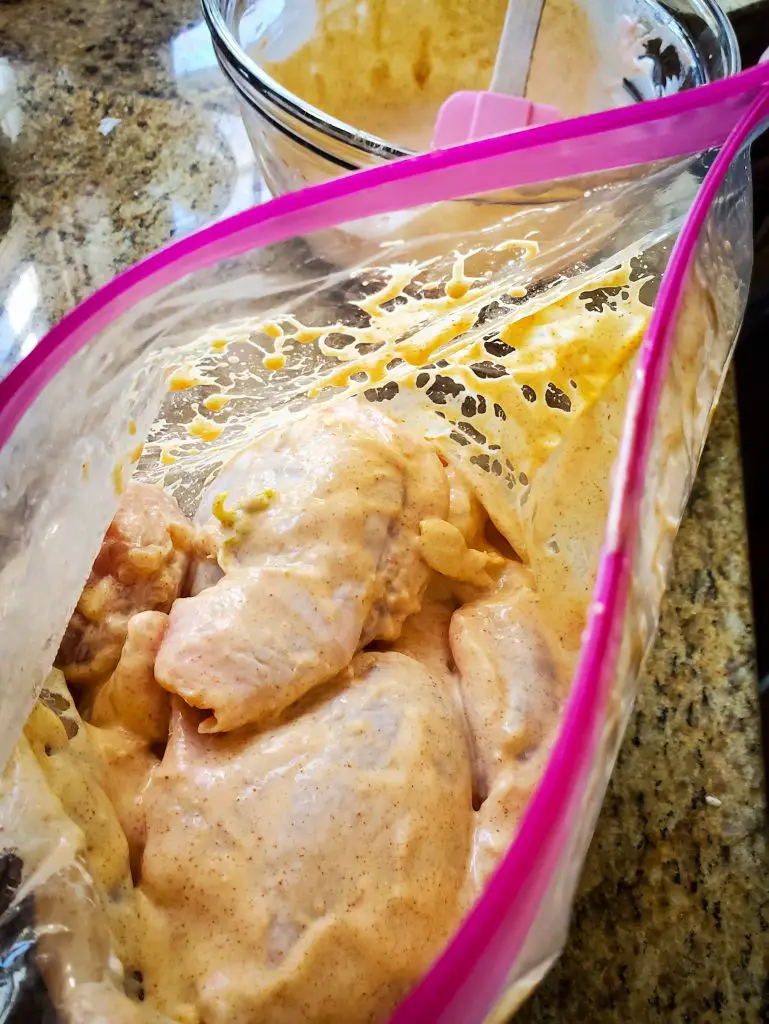 • Trim chicken of extra fat or grizzle. If using bone-in chicken thighs or breasts, leave whole and place in a large ziplock bag. If using boneless for kebabs, cut into cubes and then place ziplock bag. Add the yogurt marinade, seal ziplock bag, and massage yogurt into chicken to make sure it's fully covered. Refridgerate for 8-12 hours.