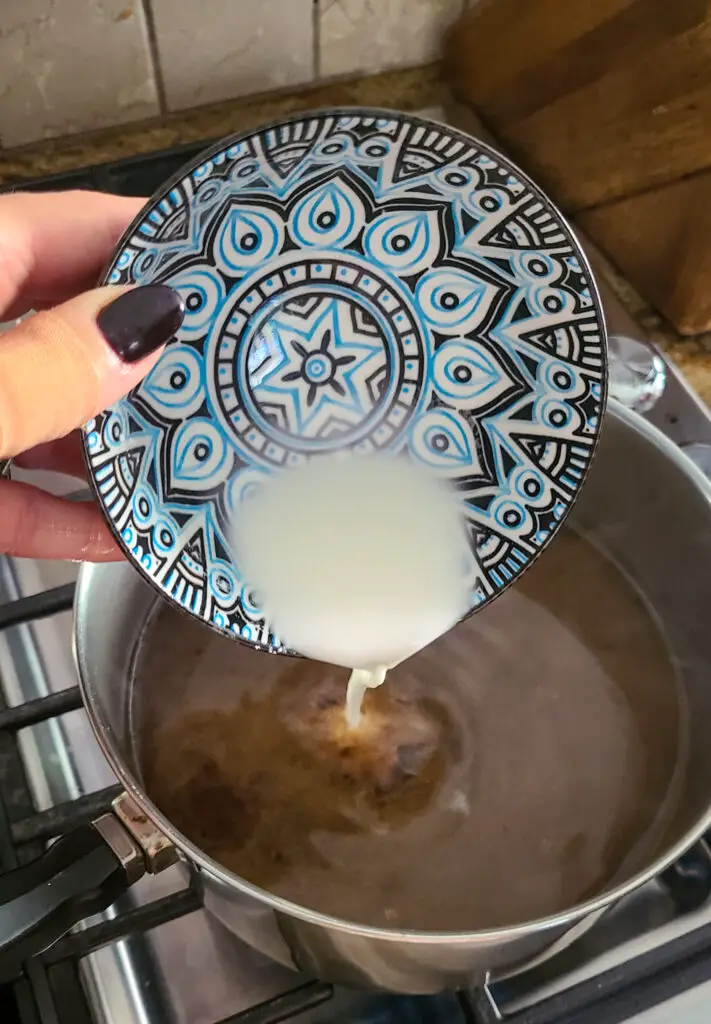 Add cornstarch/ water slurry and continue to boil to thicken gravy.